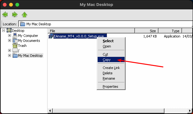 Double-click on the copied EA Setup file from the MetaTrader folder (Important: double-click within this Windows File Manager window, not in the Finder):